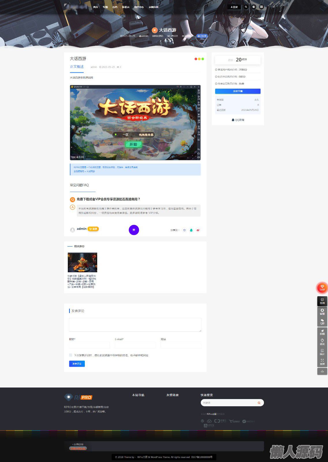 注意:使用该子主题前需要安装WordPress程序和RiPro模板