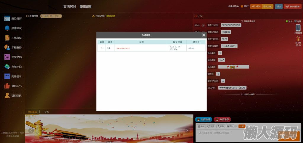 源码附带了直播可以直接对接地址,也可以调用各主流视频流,或者组合视频源,通过视频可以直观的进行实时的行情讲解或技术分析,有利于让游客更加清晰的理解。