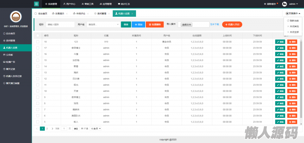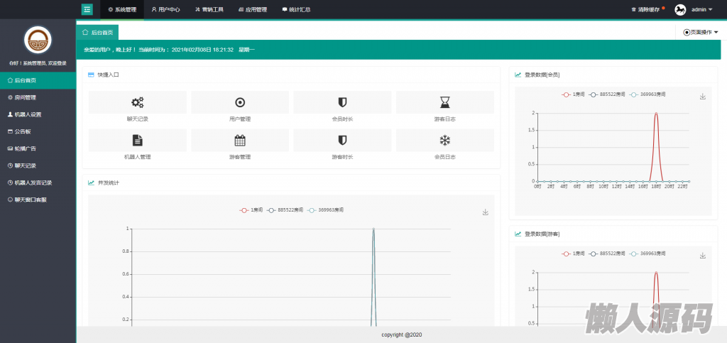 可以在后台设定机器人,前台可以机器人讲话和发布广告,直播间的,直播间的活跃度,让更多游客产生加入。潜在客户系统,看到会员列表有很多人,既然有这么多人在跟随这家公司在做,说明公司强,服务好,同器人的互动功能更强烈的烘托了,此时潜在者的从众心理一定是会发挥作用,极大的了潜在客户的转化率。
