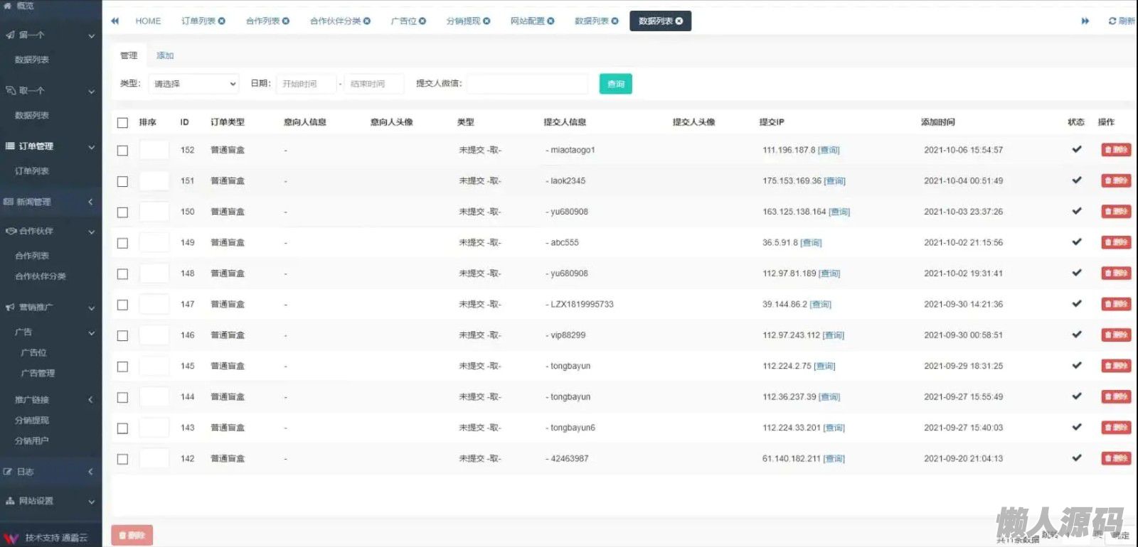 1、共分为九大模块,分别为:留一个、取一个、订单管理、新闻管理、合作伙伴、广告管理、日志、设置、系统设置;