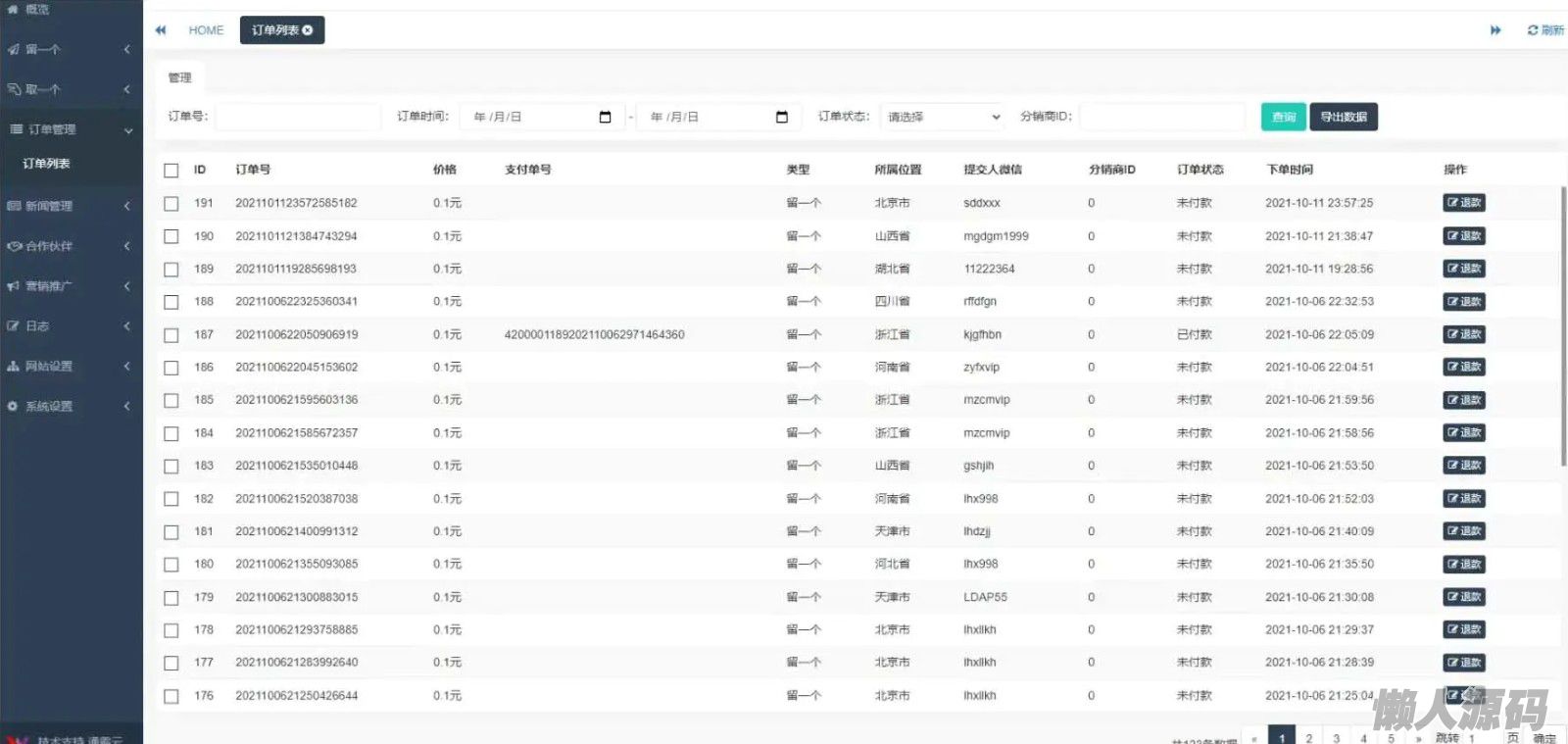 订单管理:可以对用户提交的订单信息进行查看、筛选、导出;