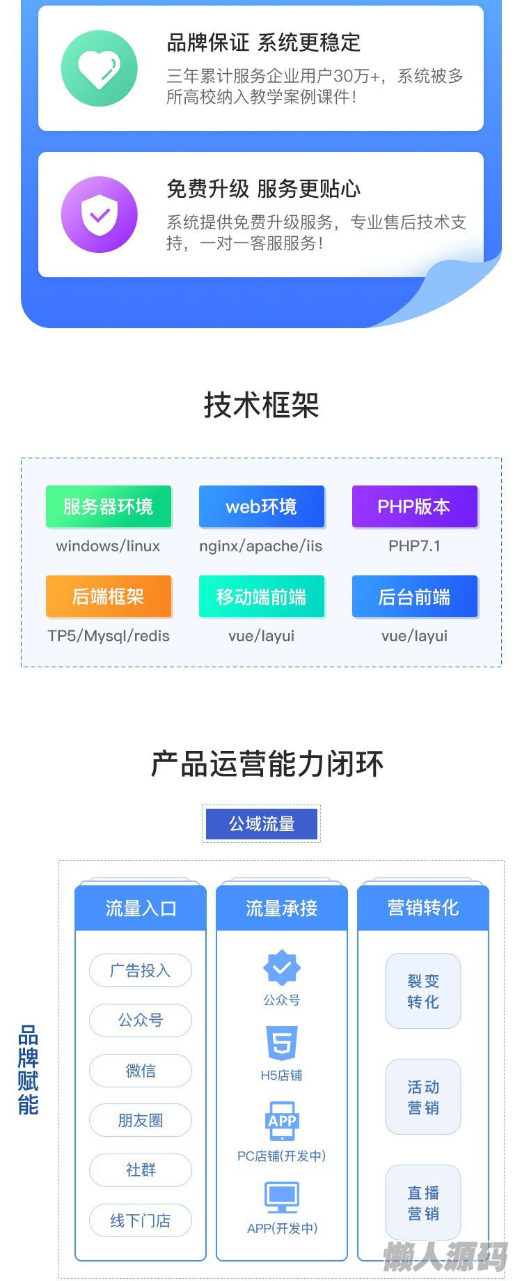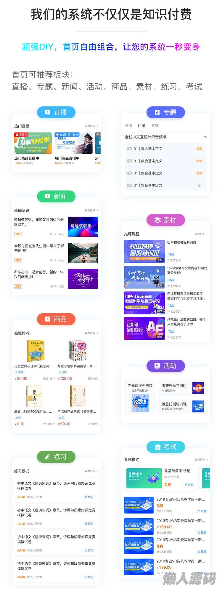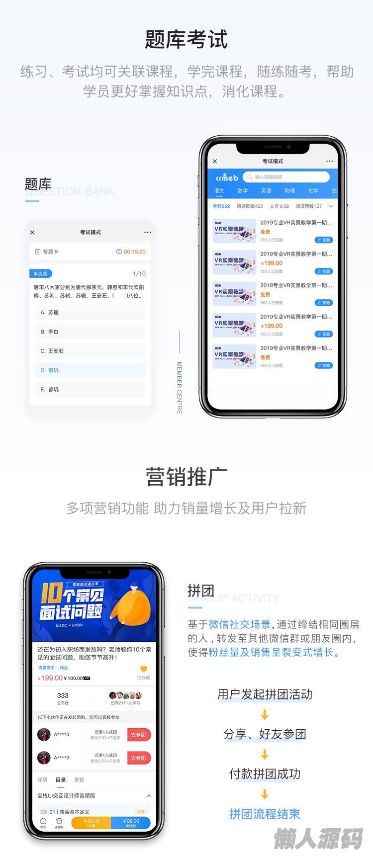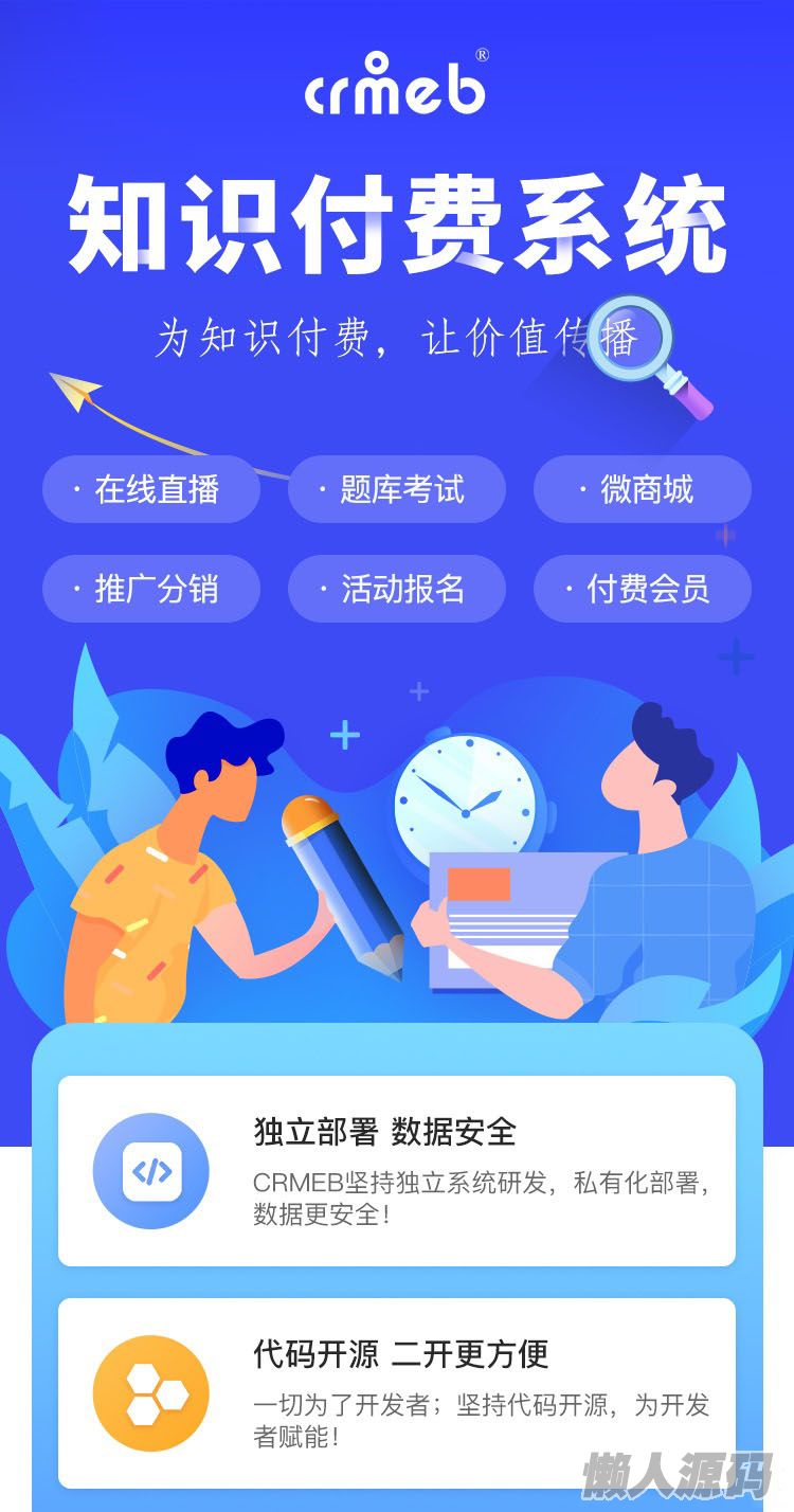 CRMEB知识付费系统其主要由课程系统、分销推广、付费会员、营销活动、支付、客服系统、文章管理、登录注册,模板消息通知等九大功能模块构成,囊括了在线教育及知识付费的大部分主要功能,支持在线推流直播、直播回放功能、录播功能、图文专题、音频专题、课程弹幕等重要基础功能,其源码全开源,无加密,完全适合企业二次开发。