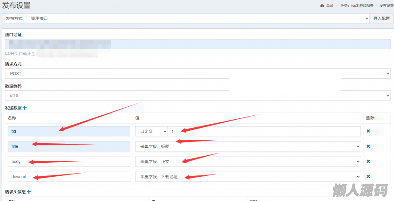 解析:tid = 栏目ID、title = 文章标题、body = 文章内容、downurl = 地址