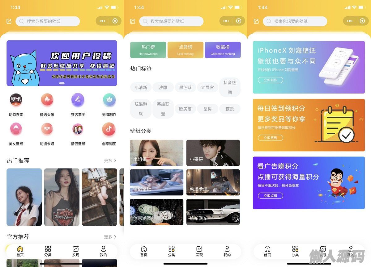 懒人源码 » 2021最新UI云开发壁纸小程序源码/支持用户投稿_站长亲测