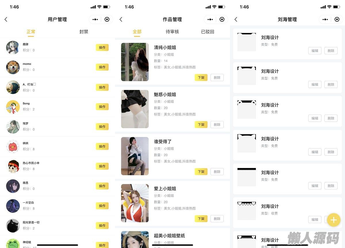 特点:支持用户投稿,后台审核后会发订阅消息给用户提示作品审核状态,用户粘性,支持后端修改/轮播图