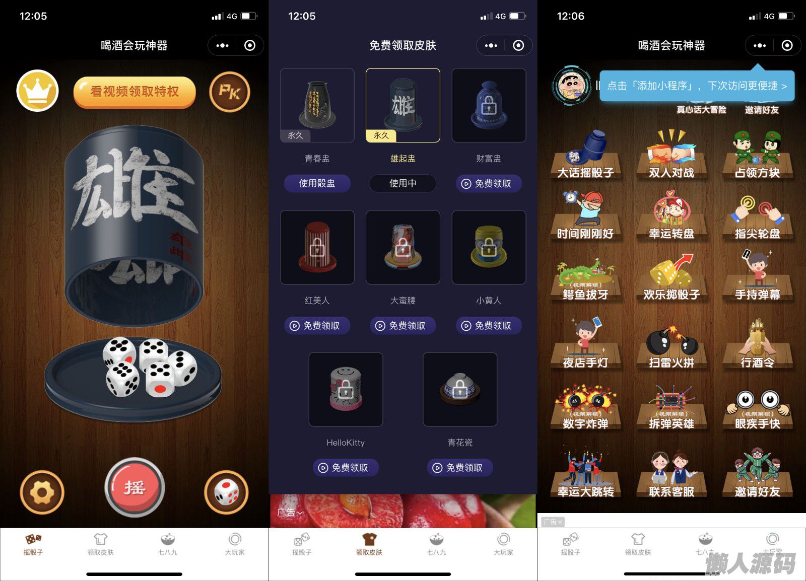 该款小程序还支持换筛盅皮肤哟,拥有多种皮肤看激励视频解释