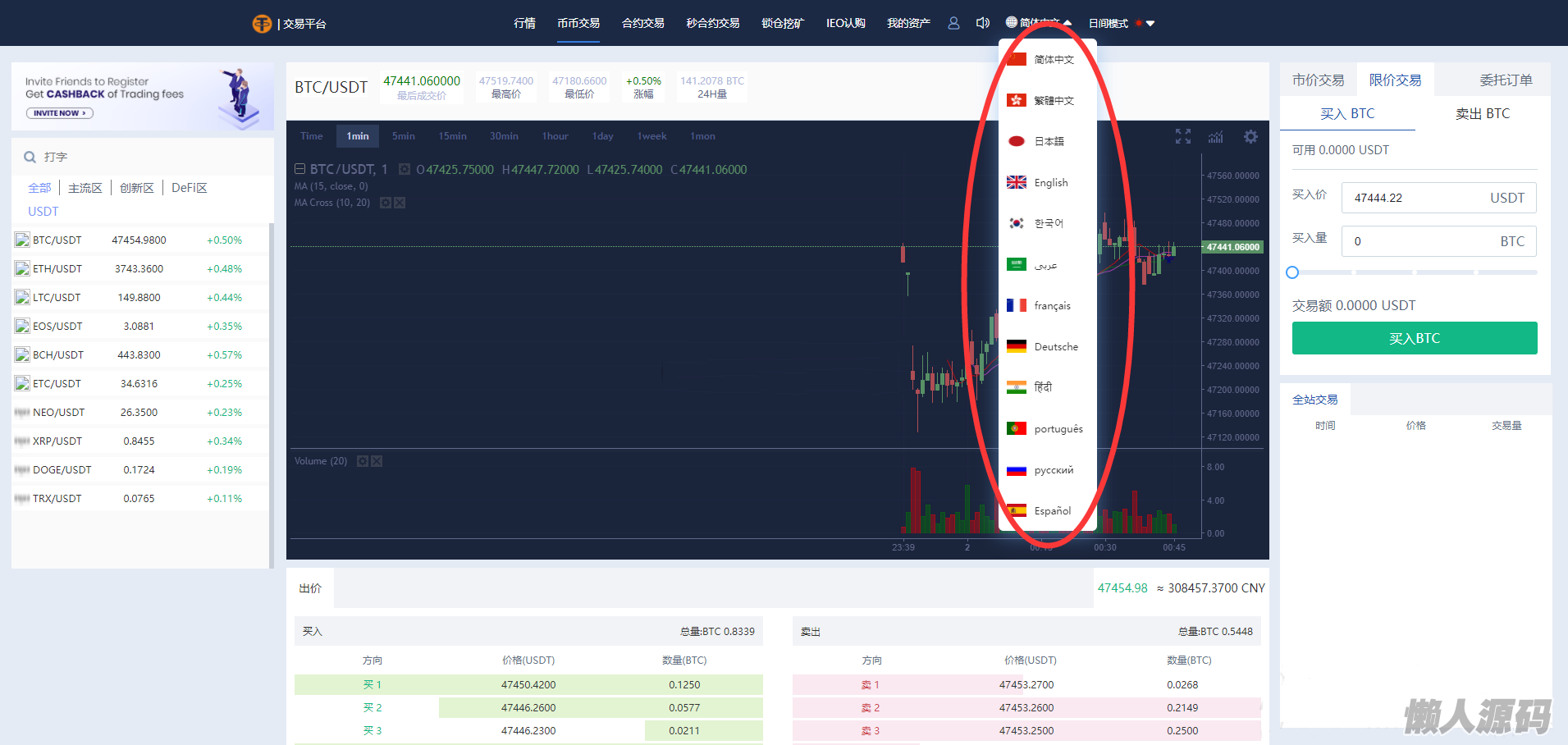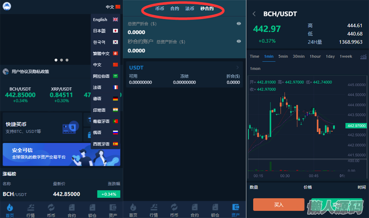 多语言交易所/12国语言/秒合约/申购/锁仓/K线完整/脚本最全/带教程/日夜模式