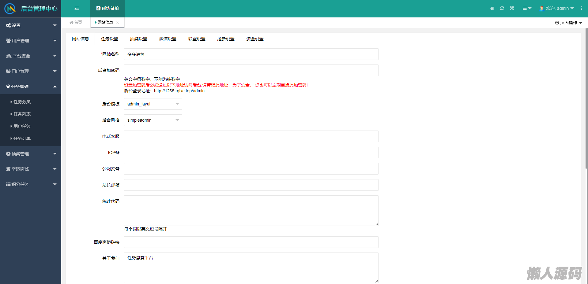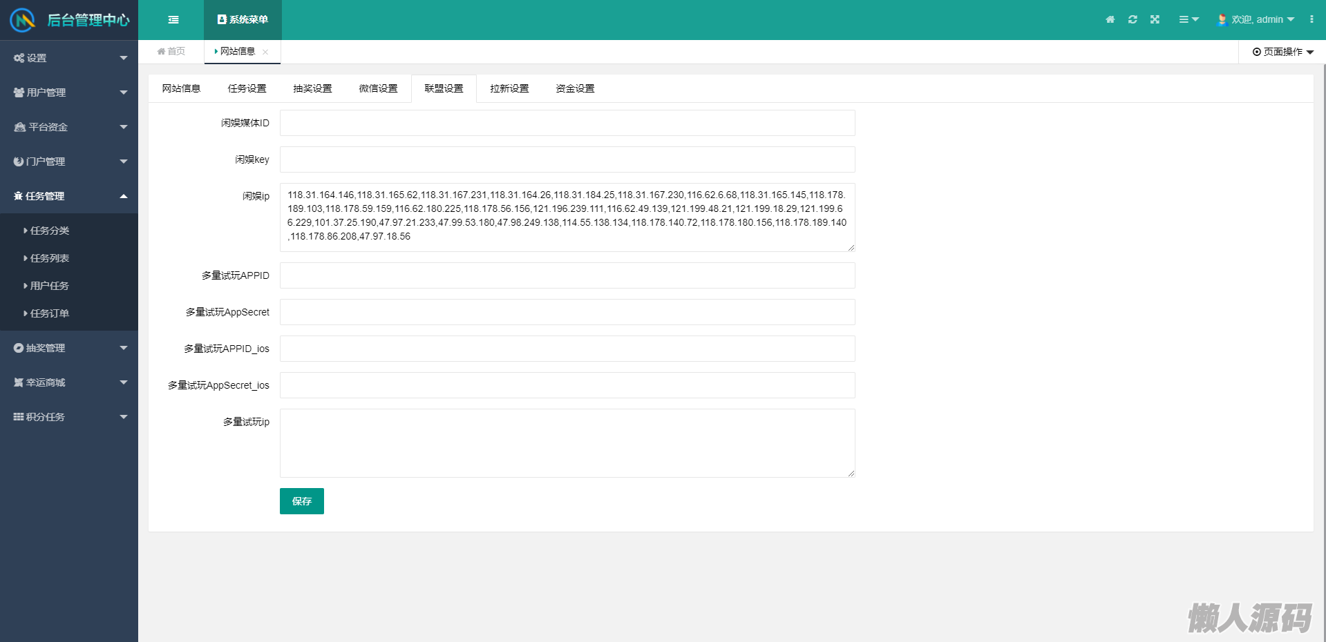 联盟配置:联盟功能接口已测试完善,并实现线上收益,每个平台管理只需要申请联盟账户即可对接联盟相关的任务。分为为8/2分配。