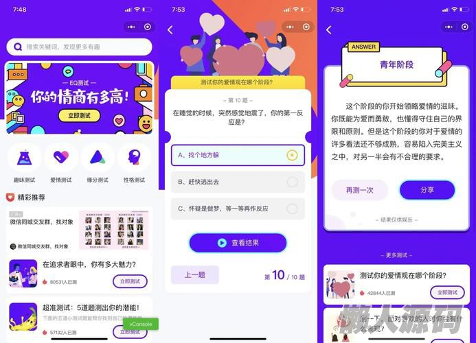 懒人源码 » 紫色UI趣味测试微信小程序源码下载包含多种评测