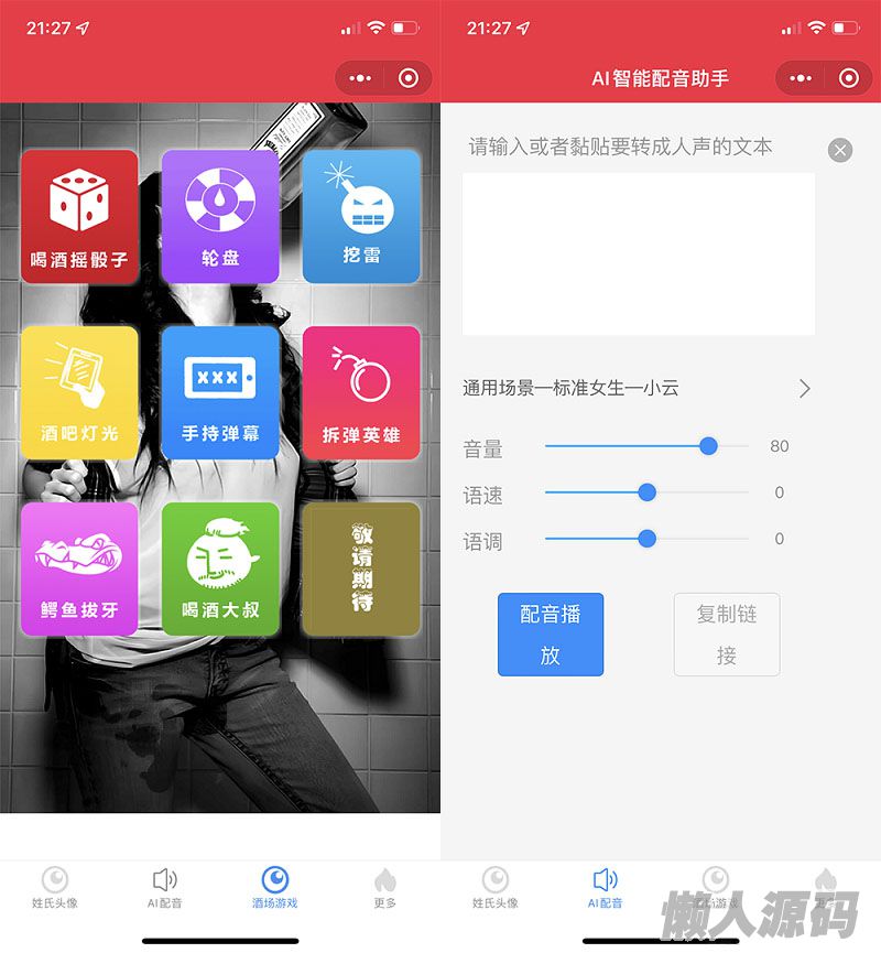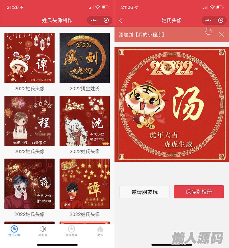 懒人源码 » 2022年虎年姓氏头像微信小程序源码+AI智能配音小程序源码+喝酒娱乐多功能小程序源码