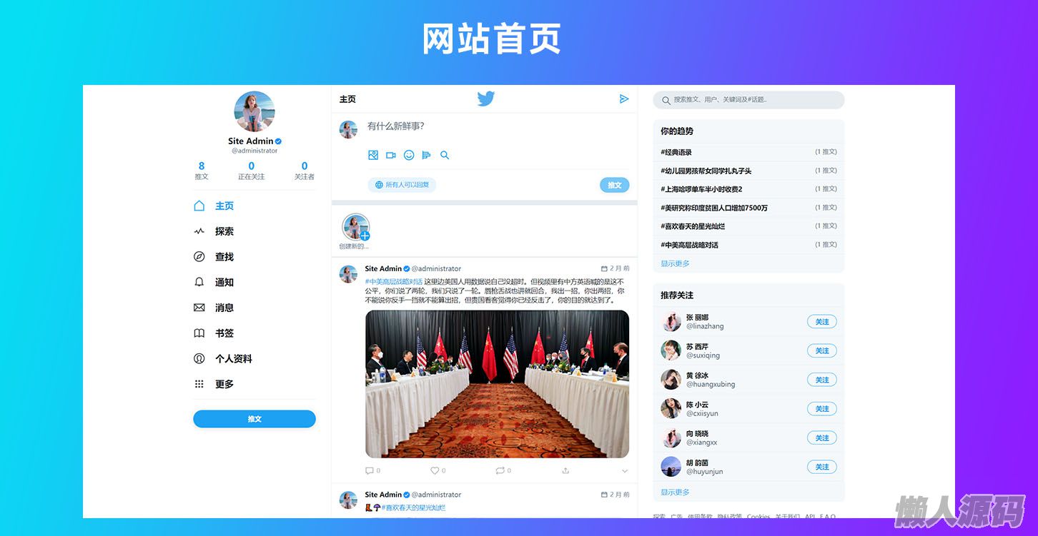这是一款类似于Twitter网站的源代码。利用原代码,你可以快速搭建自己的社交。程序语言是PHP。