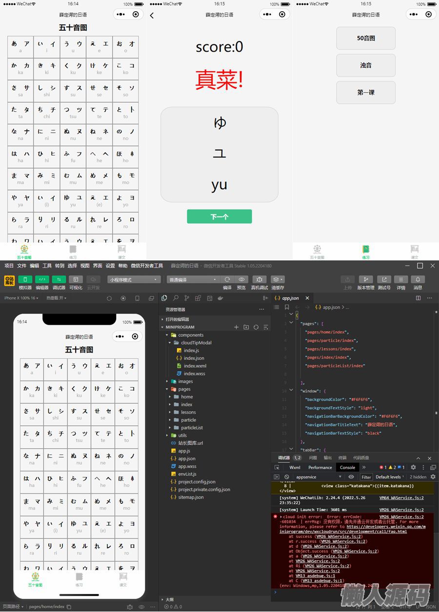 薛定谔的日语,学习日语 小程序源码 。薛定谔的日语是一款学习日语的 小程序源码 ,首页包含了日语中的50音图,让用户可以在小程序中看到日语词和跟读发音,学习完50音图以后还可以进行练习,小程序会随机提问50音图中的某一个,用户回答是否正确,对浊音也对进行单独练习,小程序中包含了多个日语课程,用户需要从课逐步学习,以达到自己预期的要求。