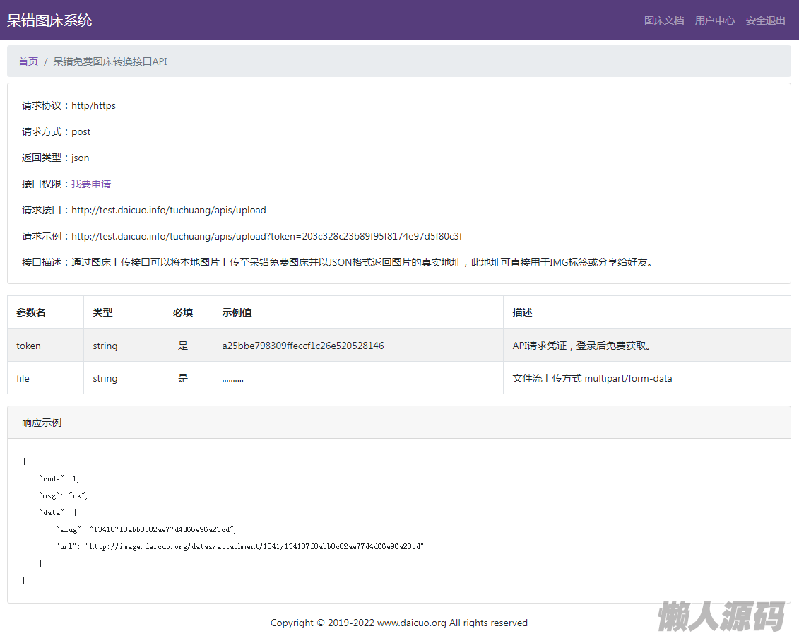 通过API上传接口可以将本地图片上传至呆错 免费图床 并以JSON格式返回图片的真实地址。