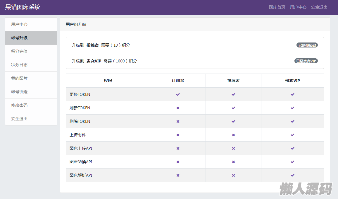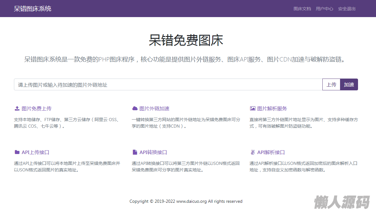 呆错 图床系统 是一款免费的 PHP图床 程序,核心功能是提供图片外链服务、图床API服务、图片CDN加速与防盗链。