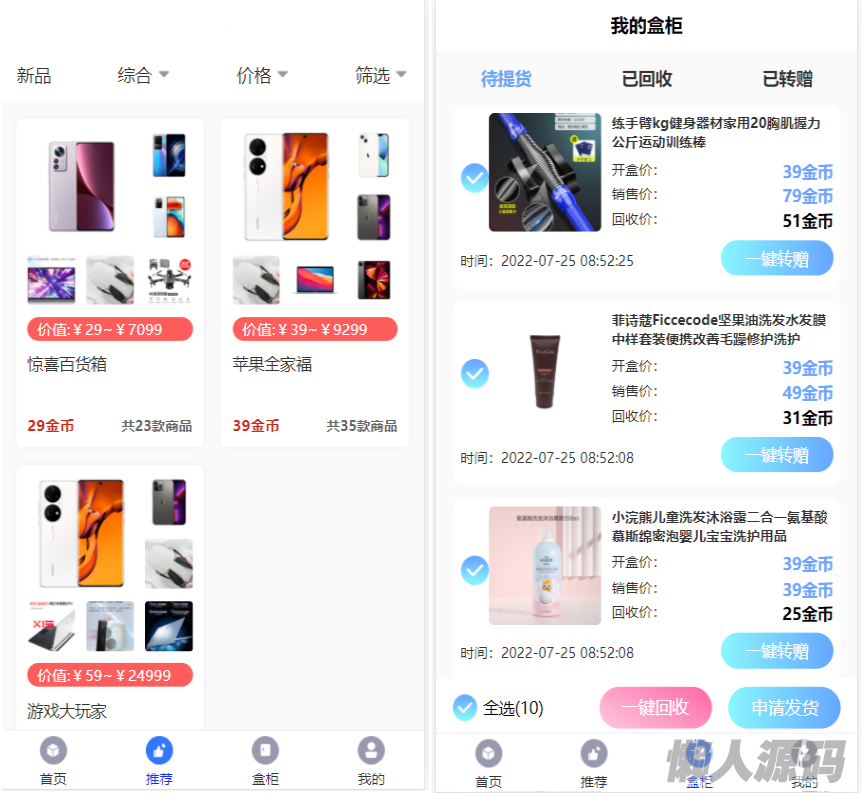 含3级分销,盲盒回收成余/额功能/晒图/盲盒转增功能。