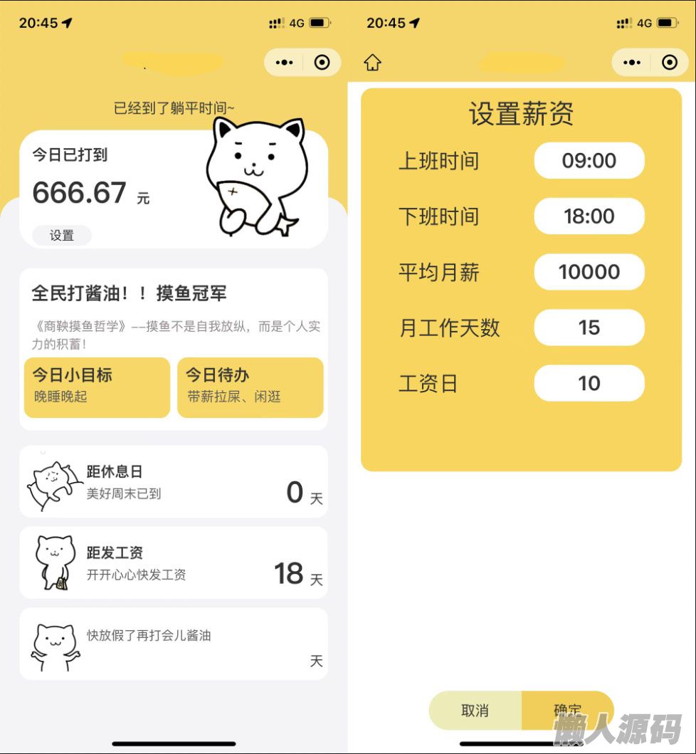 用户摸鱼小程序,可以自由设置薪资,上班时间、下班时间、发薪日、月工作天数以提醒自己摸鱼,全民打酱油,让自己成为摸鱼,《商鞅摸鱼哲学》--摸鱼不是自我放纵,而是个人的积蓄,我们的小目标是晚睡晚起,小程序中的待办会提醒用户带薪和闲逛,下方展示的是距离休息日的天数,距离下一次发工资的天数和节日的天数。