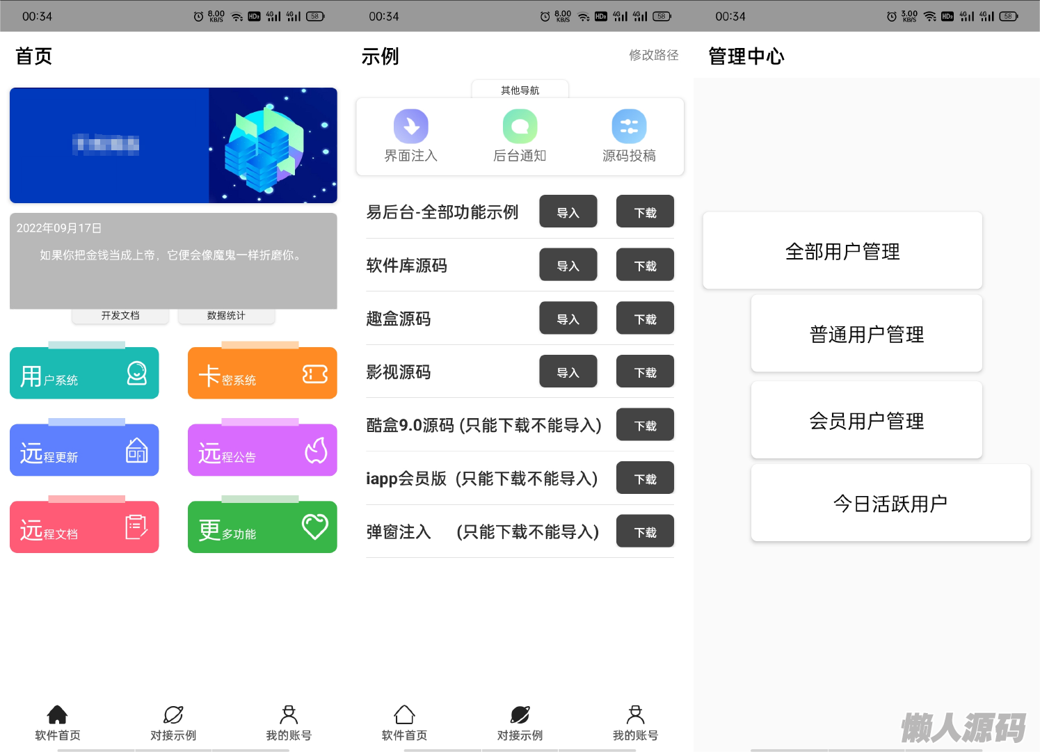 1.用户系统 2.卡密系统 3.论坛系统 4. 系统 5. 系统 6.远程更新 7.xx系统 8. 系统 9.应用托管 10. 客服系统 11.兑换系统 12.反馈系统 13.审核列表 14.维护系统 15.私聊系统 16.公共API 17.文件托管 18.xx系统,功能很强大!