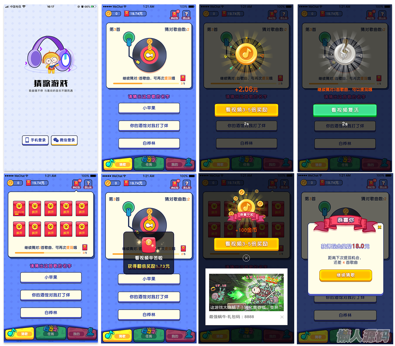 玩家可以通过猜歌、拆红包、等方式获取奖励,当累积到一定数量可以兑换现金