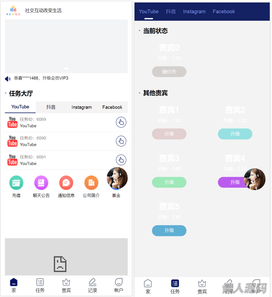 无前端源码,前端是编译后的。 内含多个海外视频平台点赞悬赏任务,跟之前发布的那些系统玩法都是差不多的, 也类似于抢单任务系统,都是抢单赚佣金,只是产品不同,这种是点赞,另外一种是。