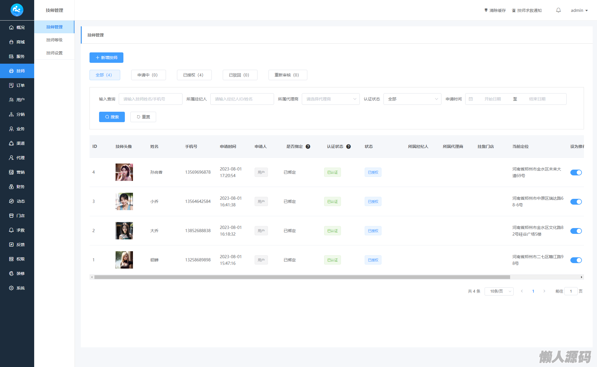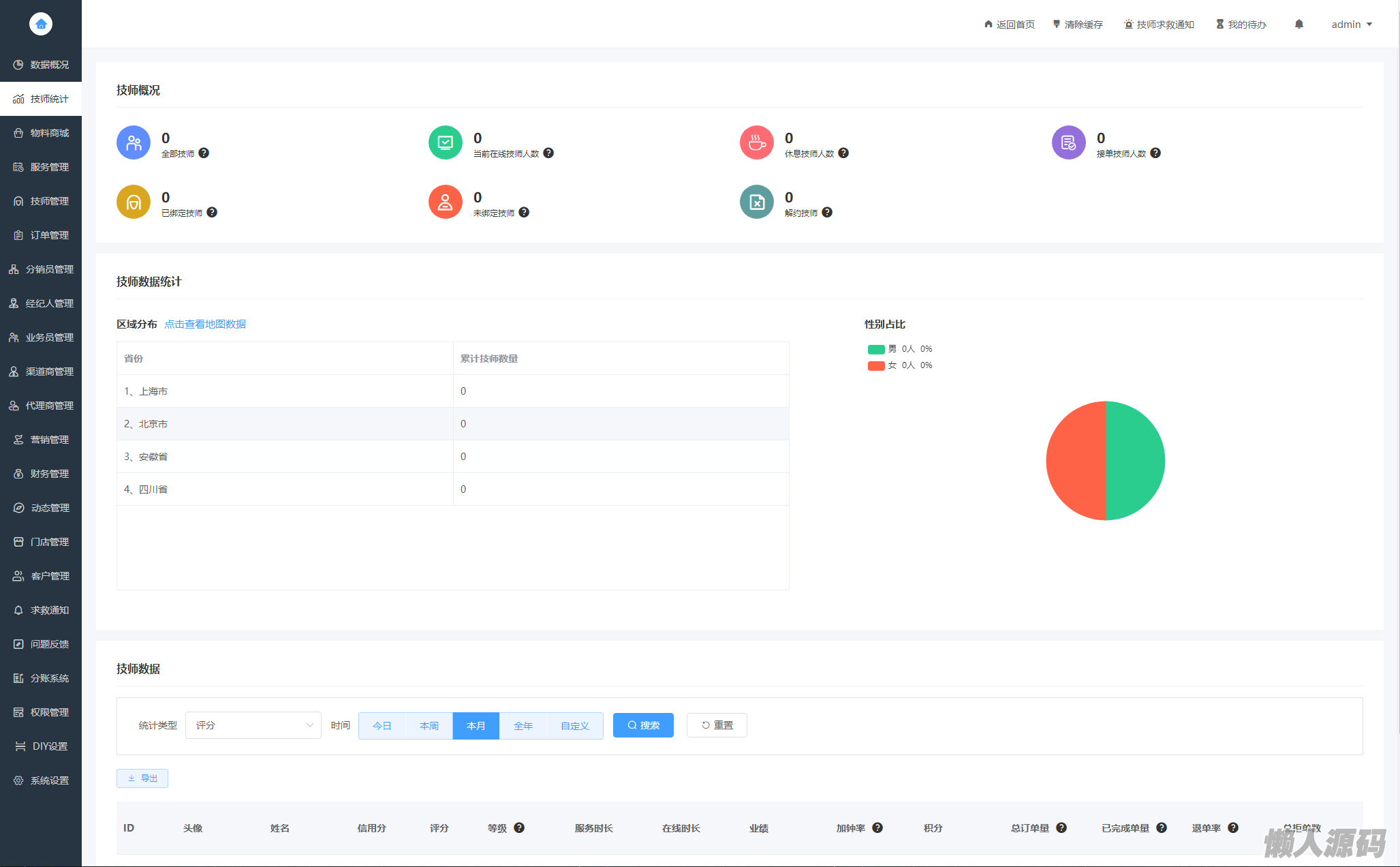 27、后台新增:技师统计(技师概况、技师数据统计、区域分布、技师数据等,可视化数据一目了然)