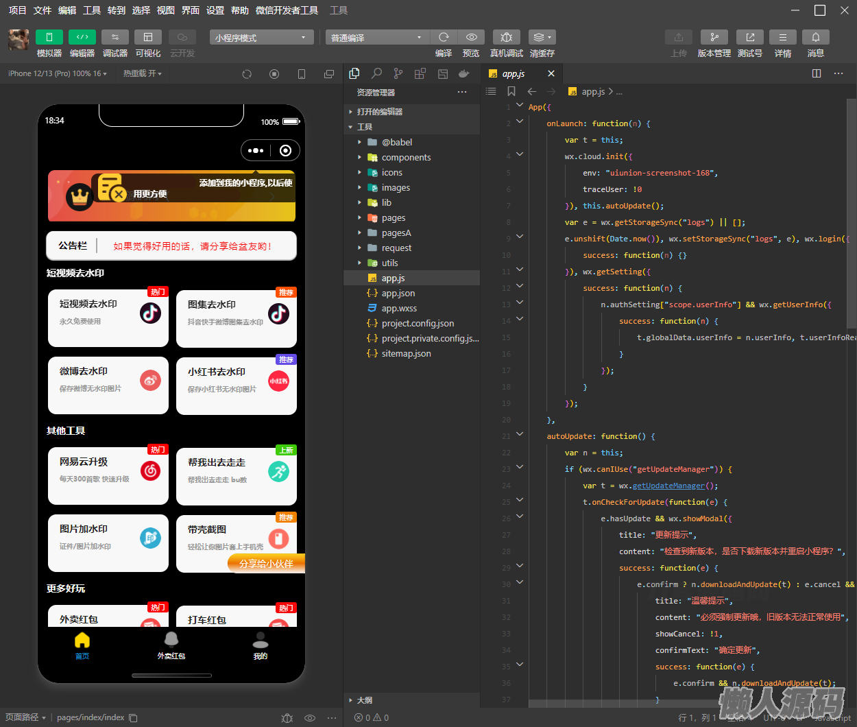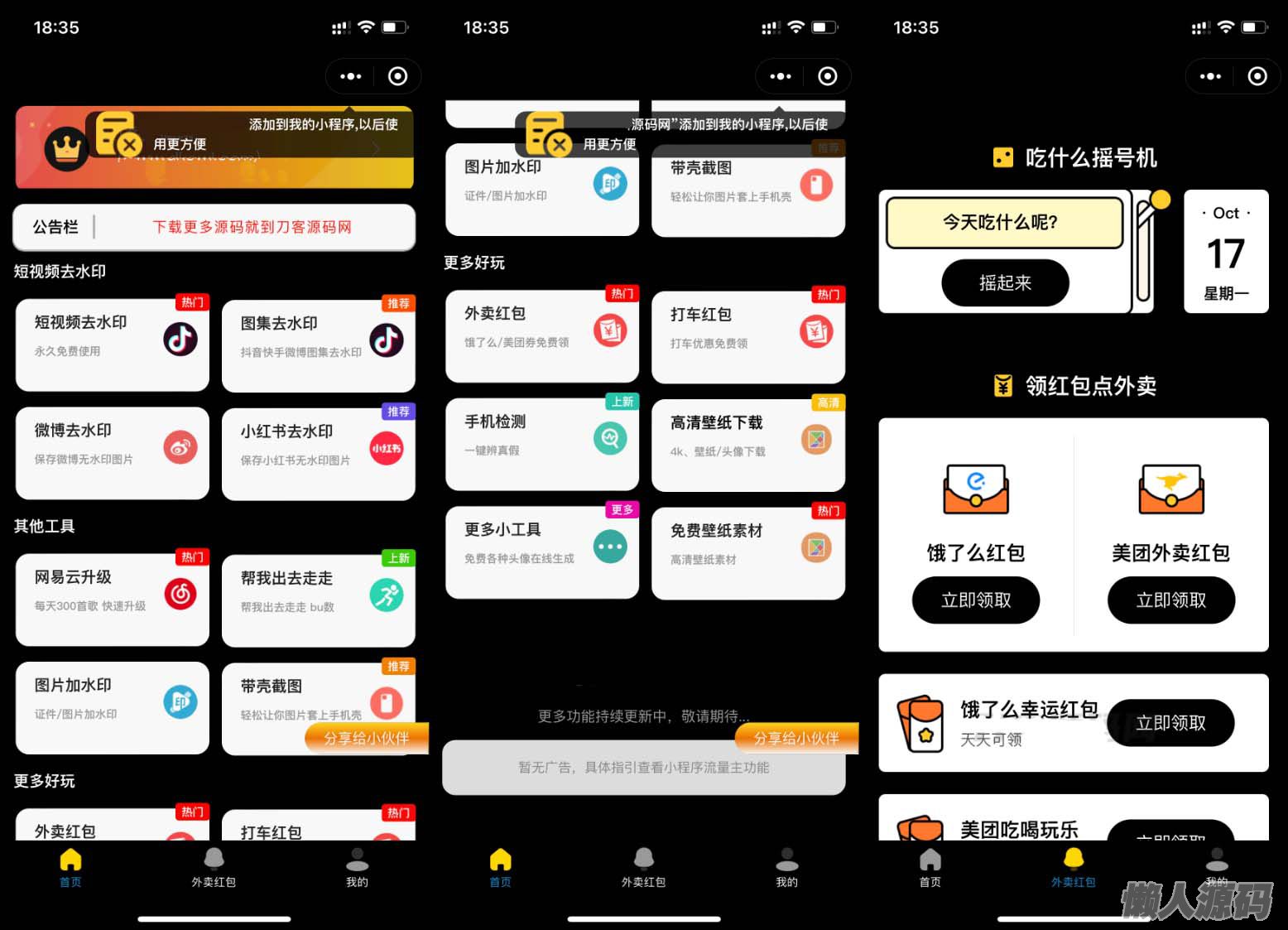 懒人源码 » 黑色简约多功能工具箱去水印外卖流量主小程序源码