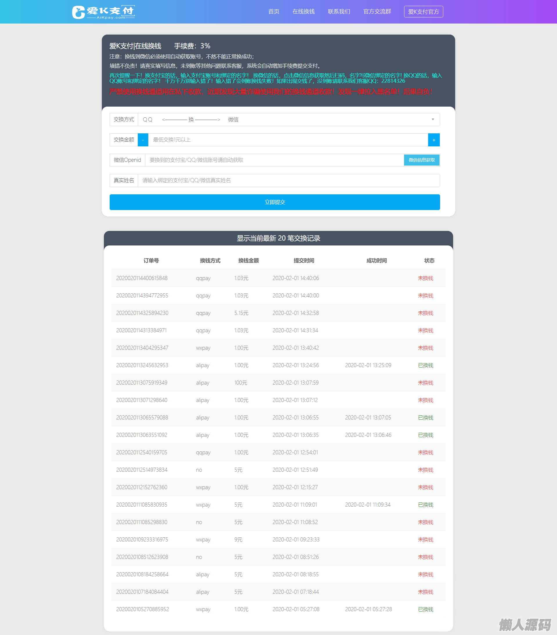 懒人源码 » 首发爱K易支付在线换钱系统最新源码