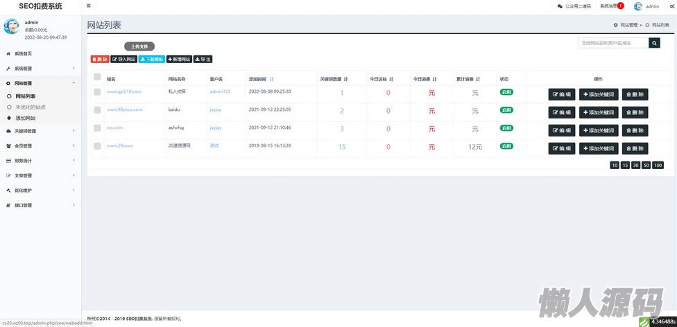 2.网站管理。总站、代理、普通用户均可添加网站,在网站列表页可以看见网站的基本信息,如:域名、网站名称、所属会员、注册时间、关键词数量、达标关键词数量、消费、历史消费及网站启用与禁用状态;