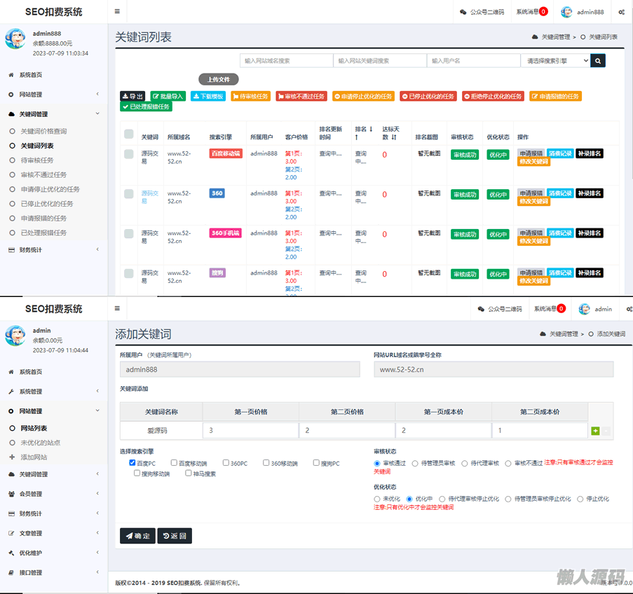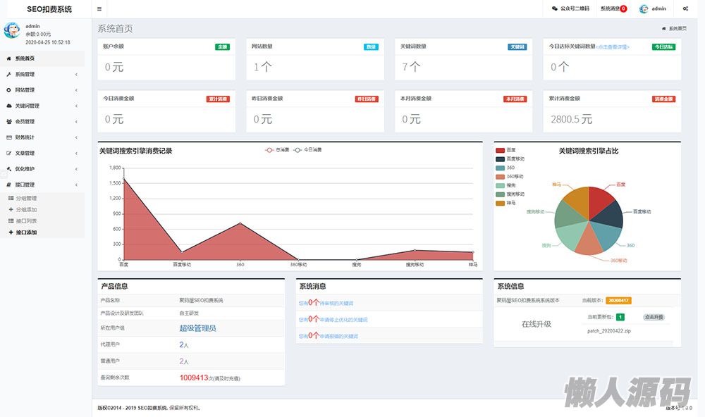 懒人源码 » 新版SEO按天扣费系统_SEO扣费系统源码_关键词排名监控_网站排名监控工具/ThinkPHP内核