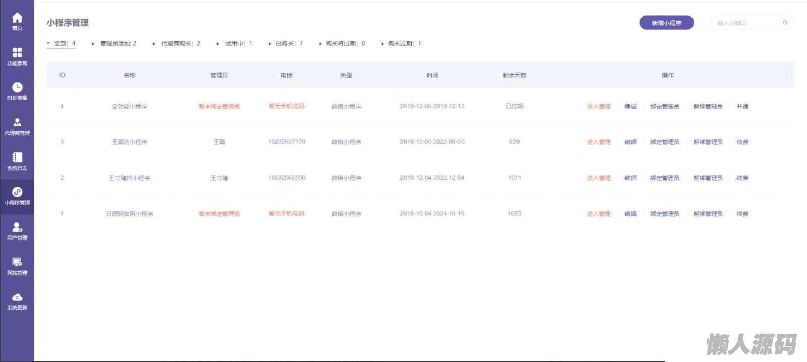 代理商管理:拥有底层源码系统,发展自己的代理商,列表清晰展示各代理商状态,详细设置对代理商账号信息、创建小程序的个数、系统到期时间等进行管理。