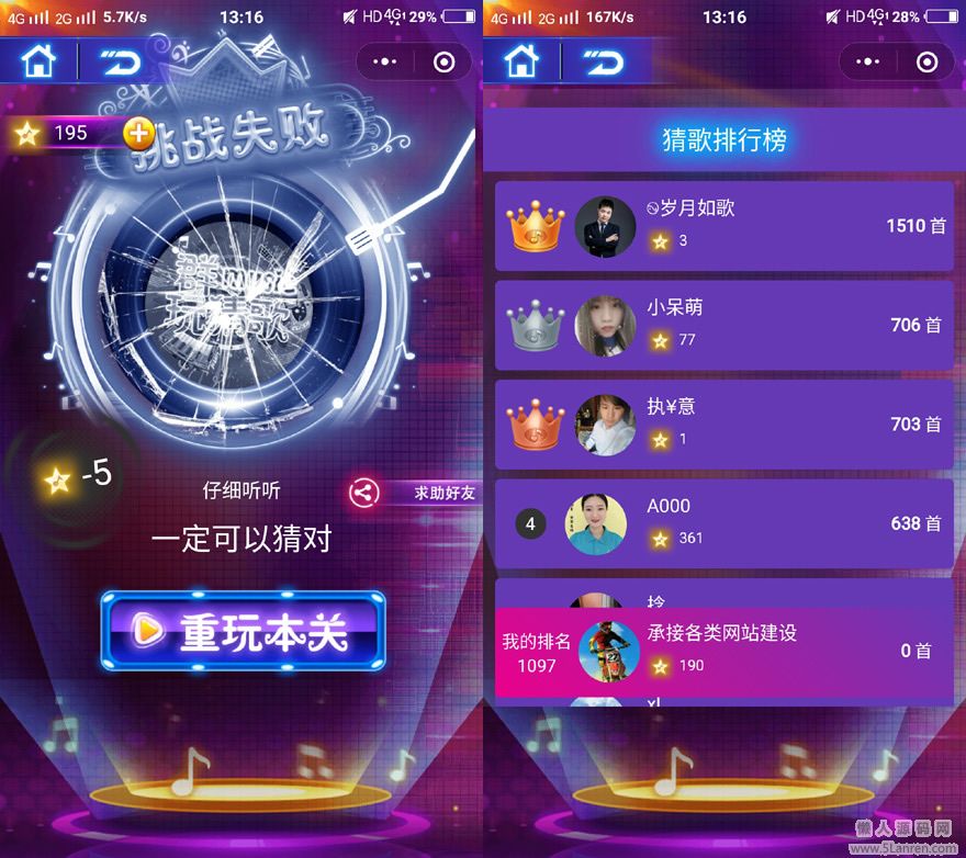 2,程序自带5417条猜歌数据,10000多段歌曲(包括猜歌前奏及答对后的音乐),所有MP3资源加在一起有2G多,当然歌曲都已经存阿里云可直接使用,你可以上传到自己的调用。