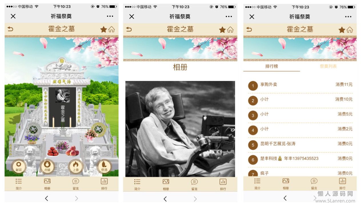6.墓园里面包含:生平简介功能,相册功能,留言功能,祈福排行版功能,收藏墓园功能