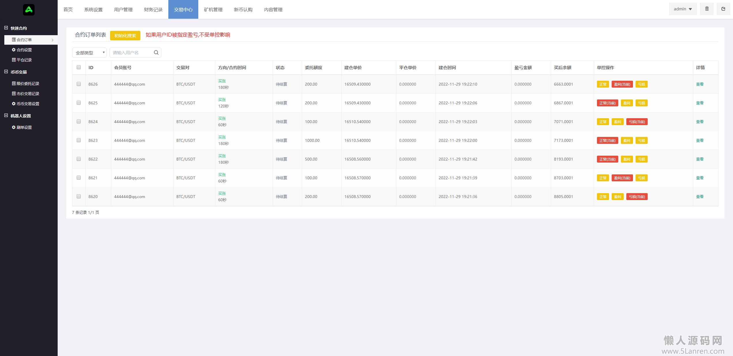 购买合约订单后台订单可以看到用户买过之后余额方便控单