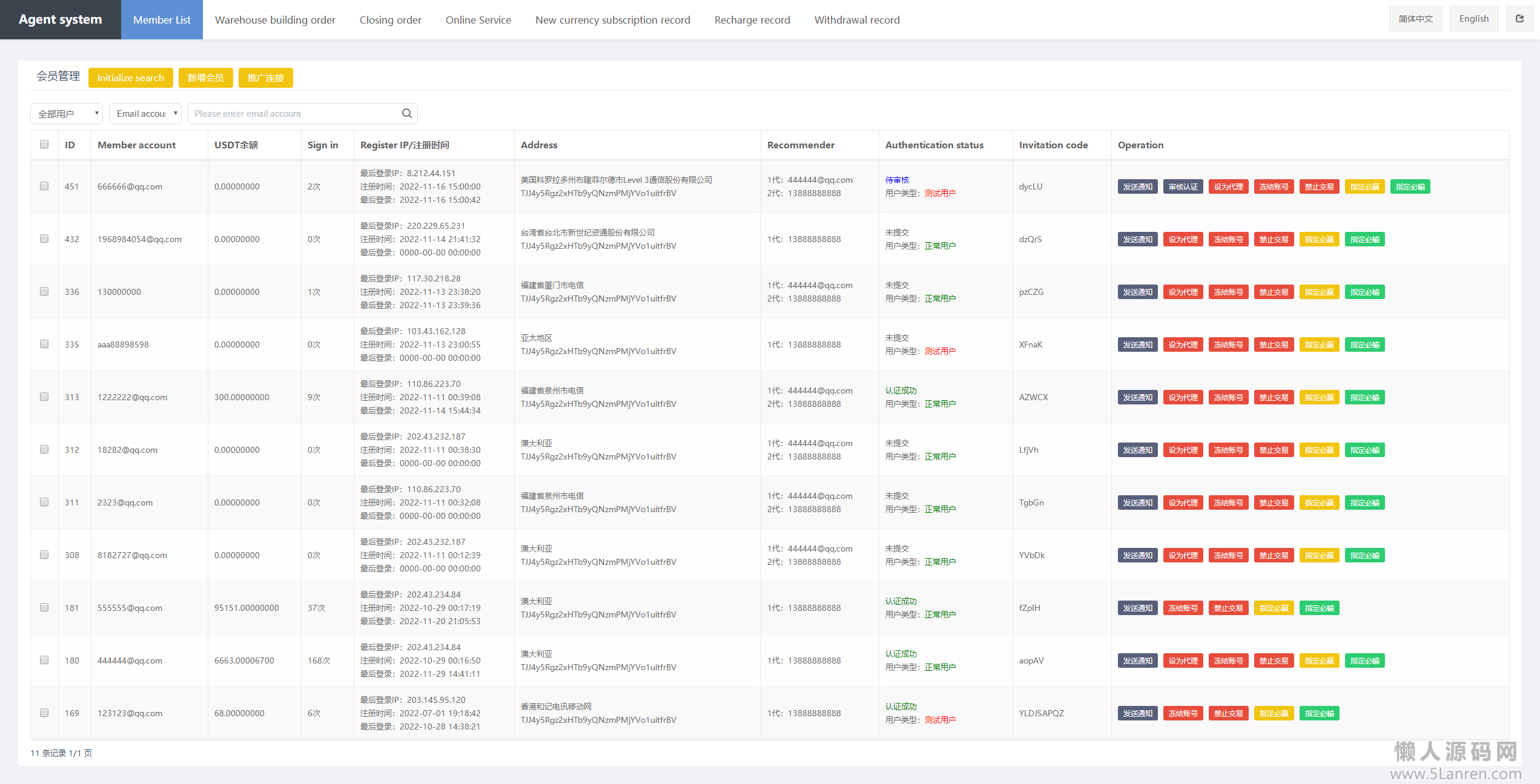 代理可以直接在后台添加会员账户,添加后直接成为自己下面的一级用户