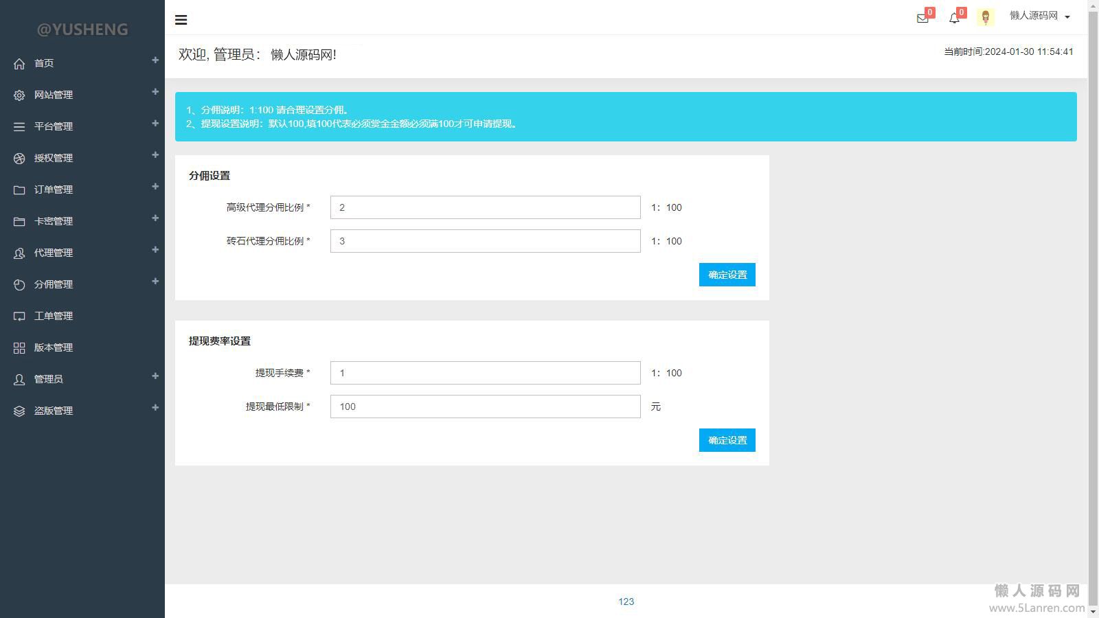 4、添加代理、代理管理、分佣设置、分佣明细、列表、工单管理、版本管理。