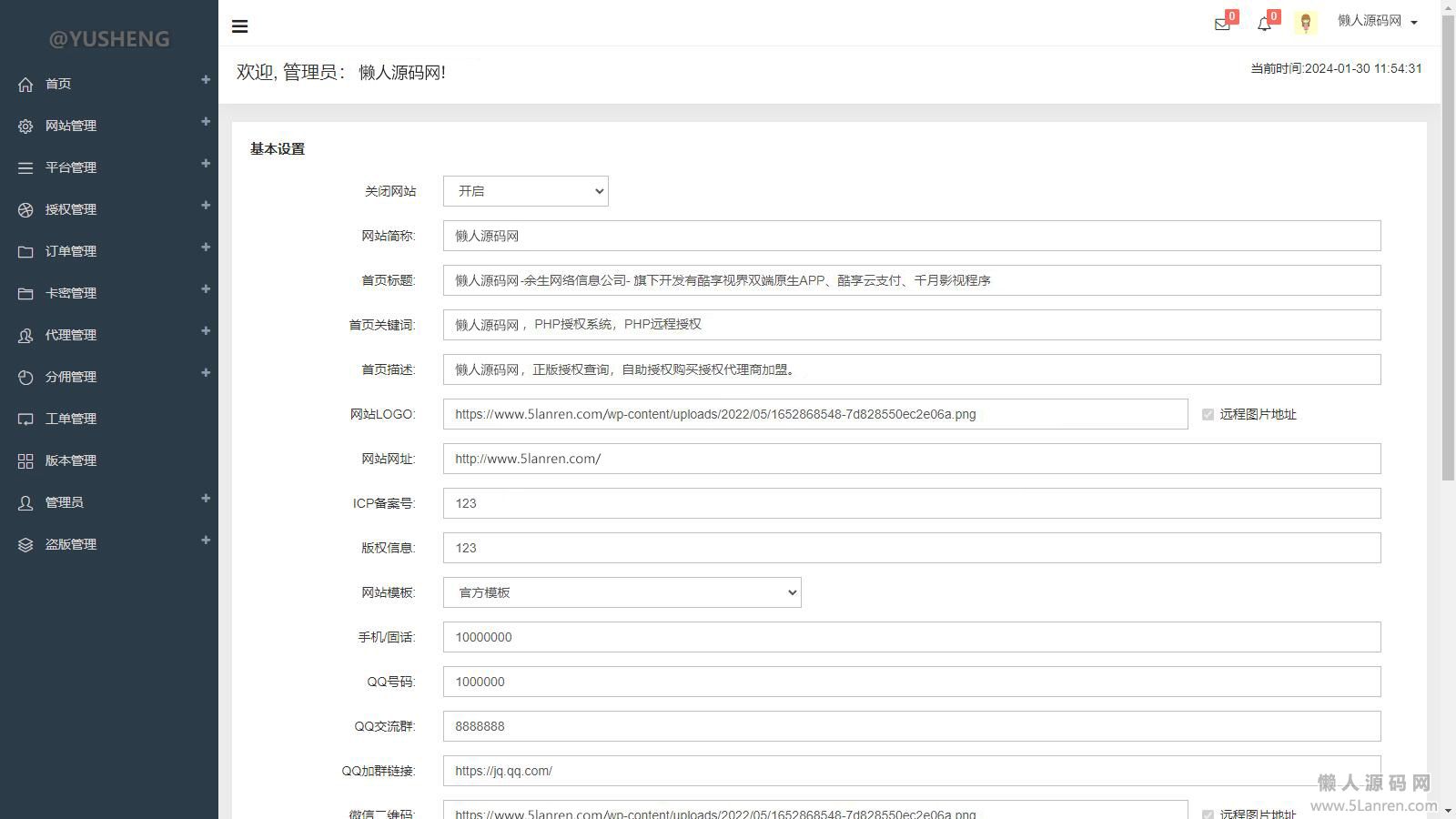 1、网站基本管理、系统设置、公告设置、接口设置、价格设置、设置。