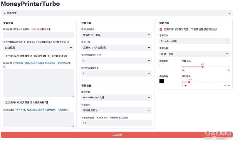 懒人源码网 » 全自动ai生成视频MoneyPrinterTurbo源码