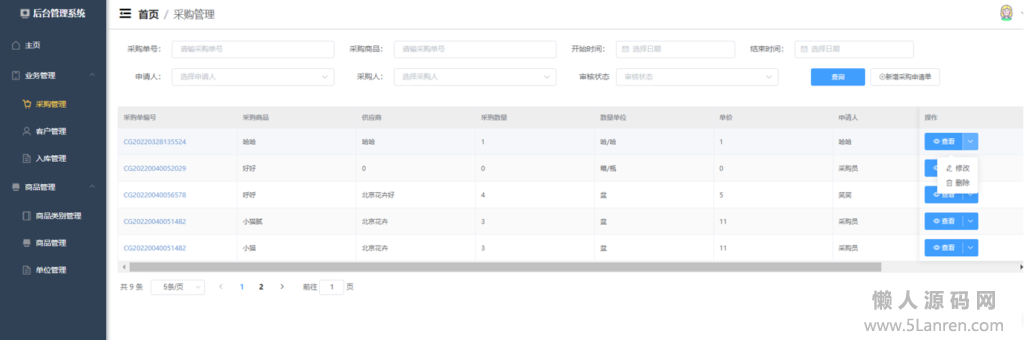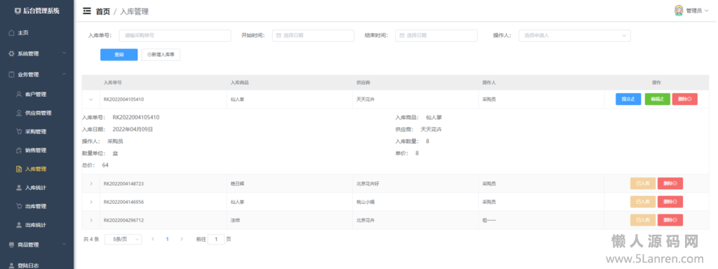 采购入库管理:采购员录入采购申请单,由审核并入库。