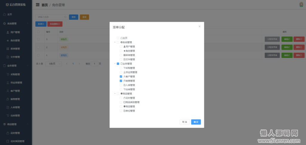 角色管理:分配菜单权限。