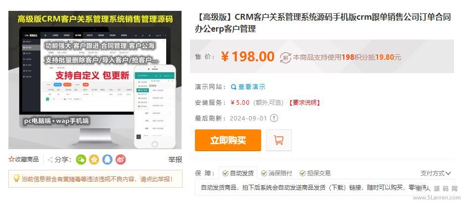 某站价值198的【高级版】CRM客户关系管理系统源码手机版crm跟单销售公司订单合同办公erp客户管理