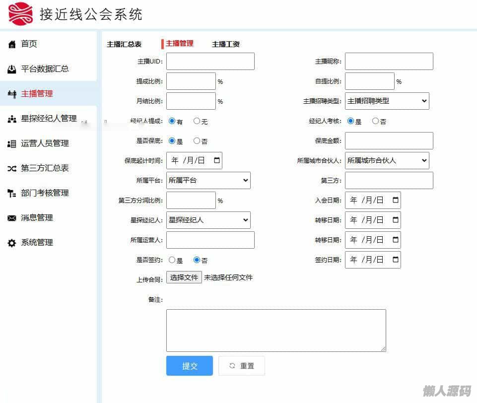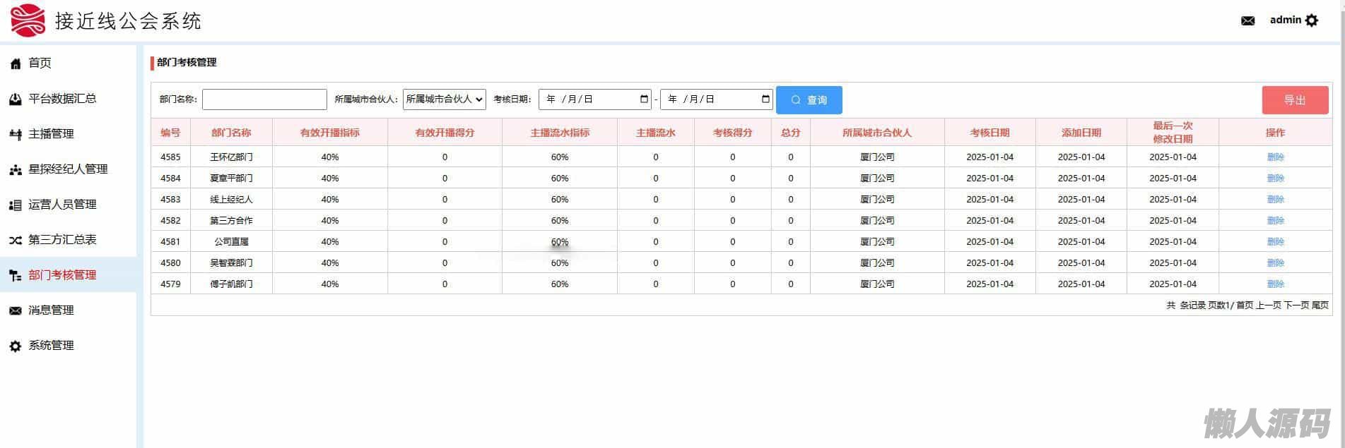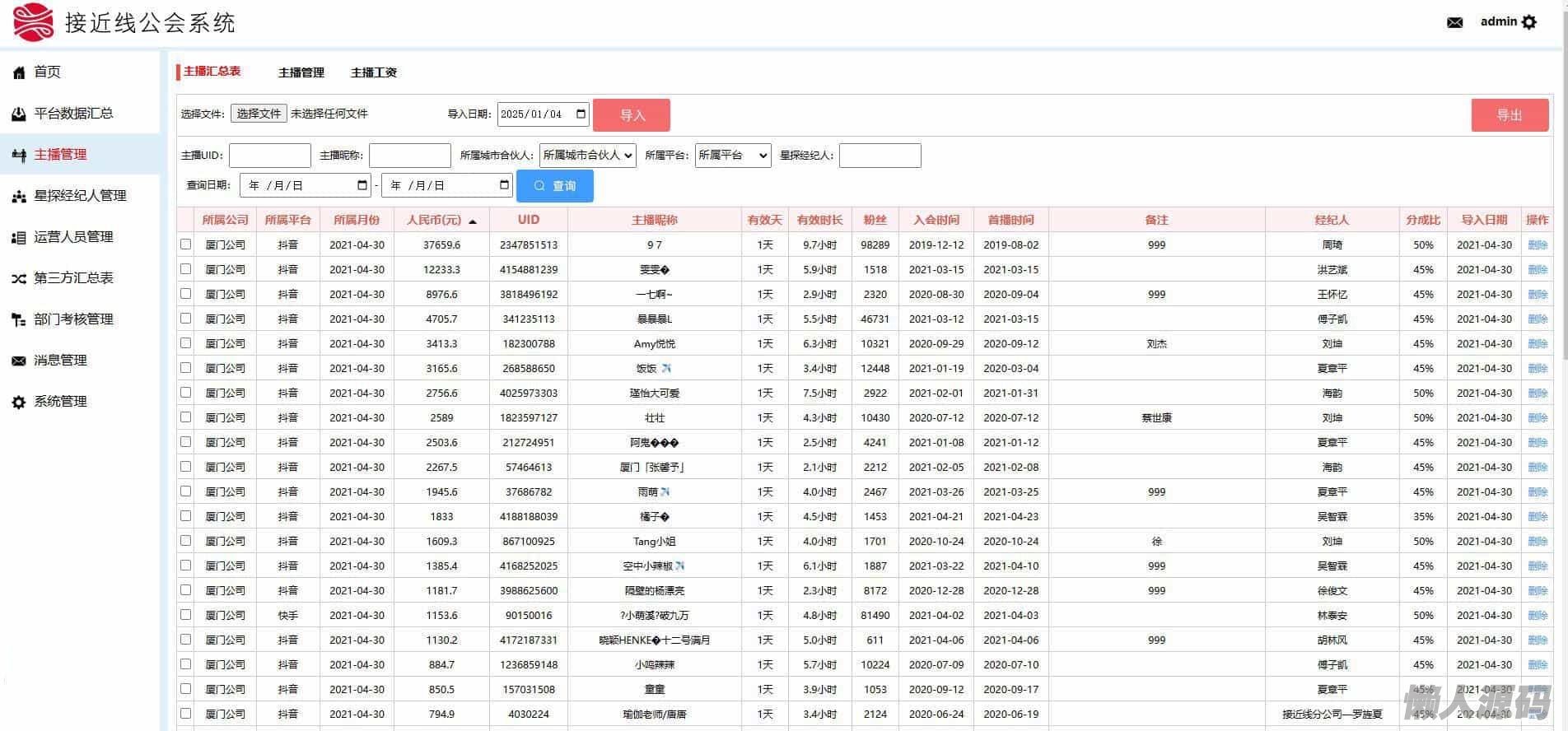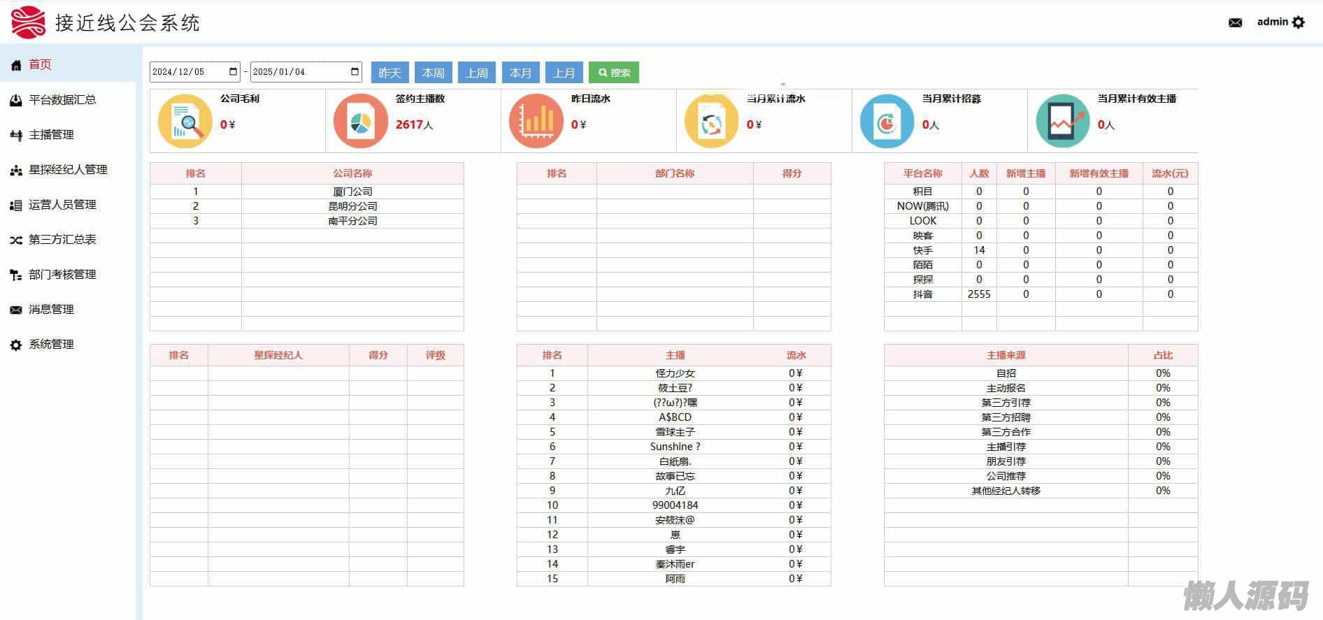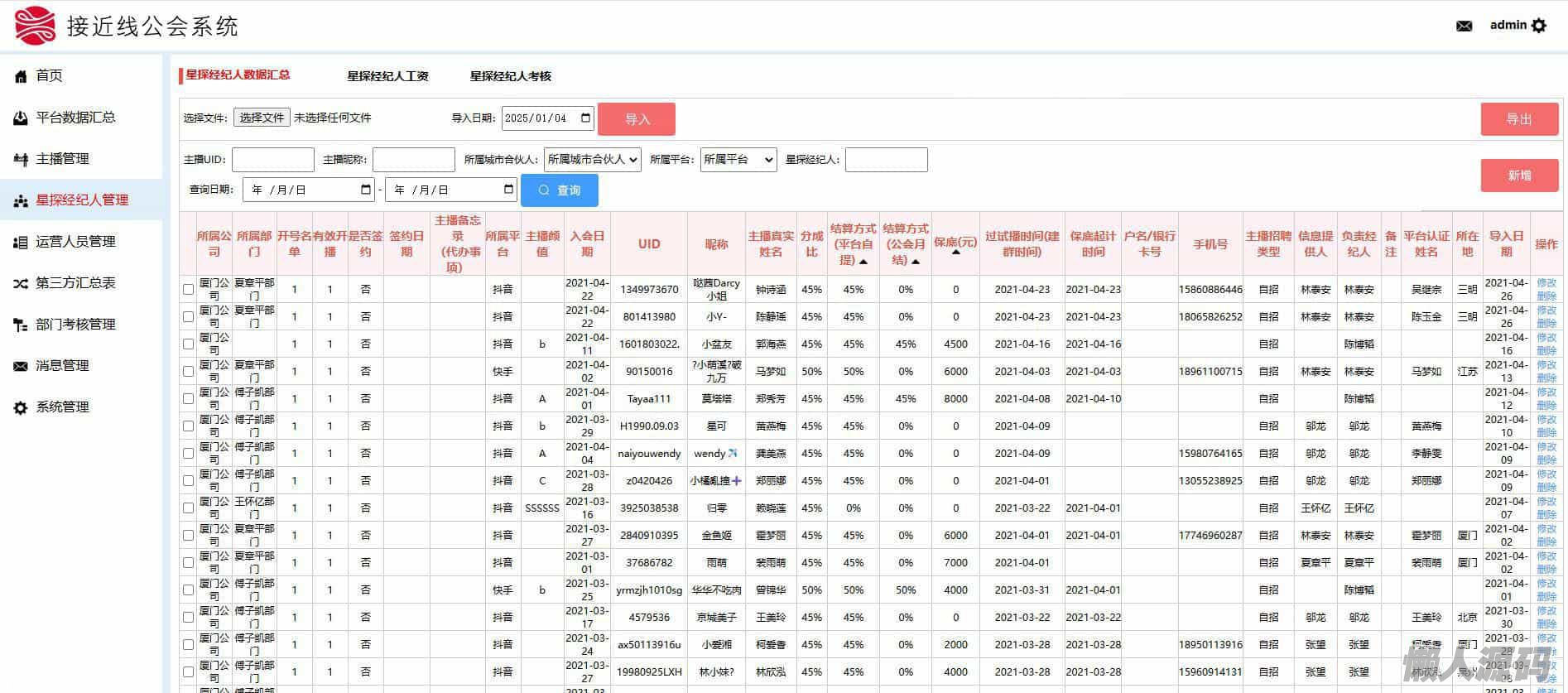 懒人源码网 » 工会系统抖音快手等多平台主播分红分润系统星探经纪人城市合伙人多角色管理系统分红统计系统