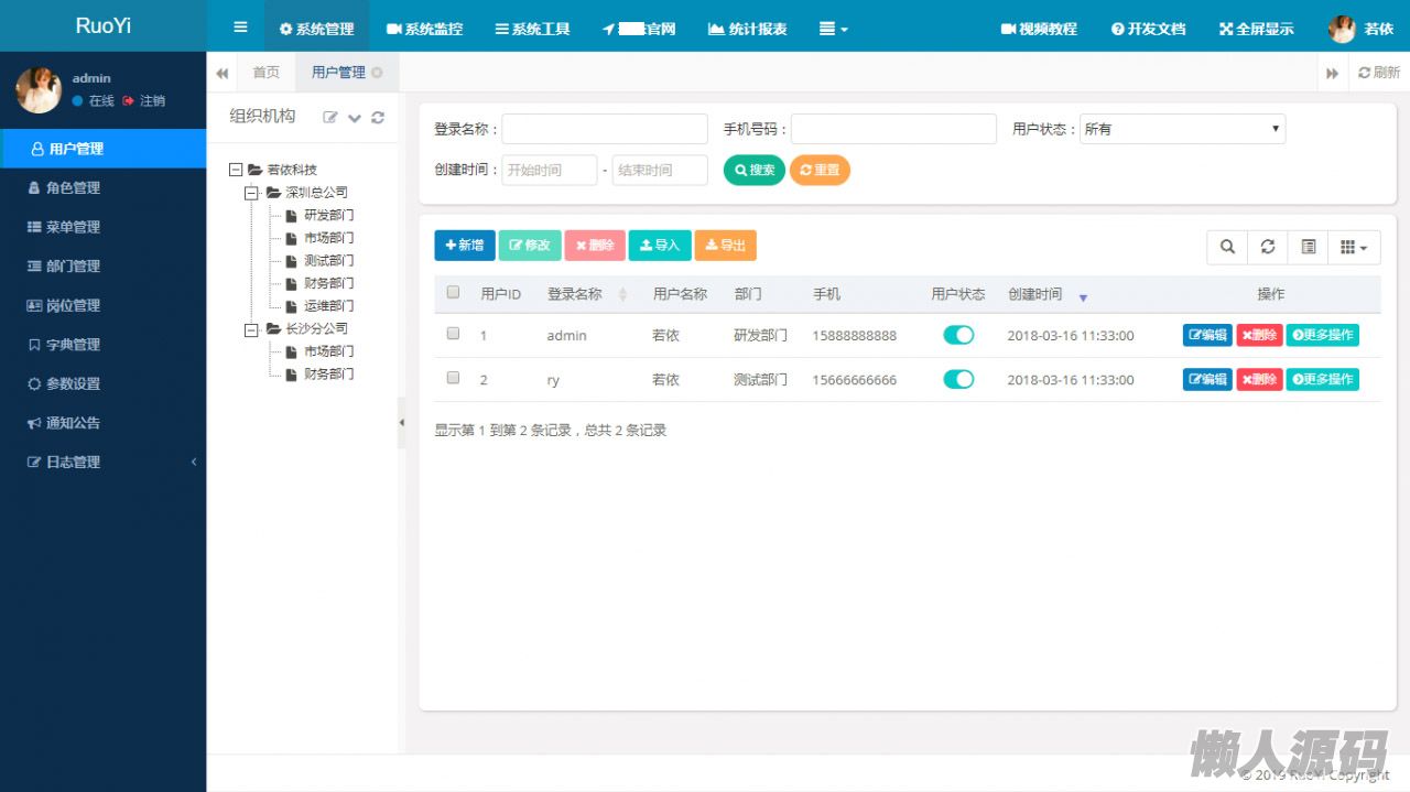 RuoYi 若依 管理系统 是一个基于 SpringBoot 的权限 管理系统 ,代码易读易懂、界面简洁美观。 核心技术采用Spring、MyBatis、Shiro没有任何其它重度依赖。直接运行即可用。