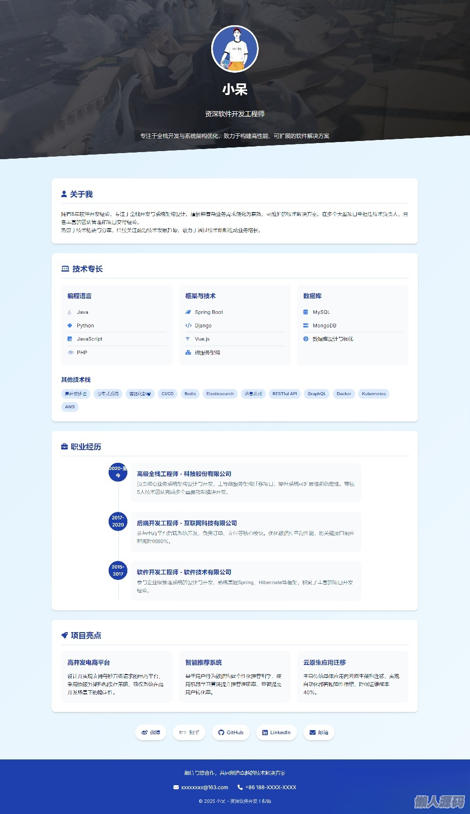 该采用蓝白配色方案,通过深蓝到浅蓝的渐变设计,突出技术性与可靠性。界面融合圆角与阴影等柔和设计元素,在保持技术严肃感的同时增强亲和力。通过字体大小、颜色和间距的合理运用,建立清晰的信息层次结构。以内容为核心,采用技能导向布局,将技术栈置于显眼位置,突出核心竞争力。时间线功能清晰展示职业发展轨迹,提升可信度。项目亮点模块通过实际案例证明技术能力和项目经验。