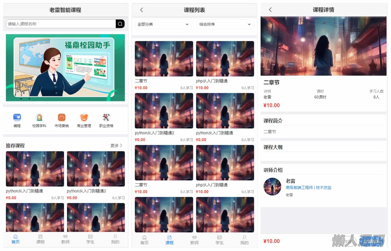 懒人源码 » 智能课堂课程系统 PC+H5手机端自适应 支持讲师课程等功能