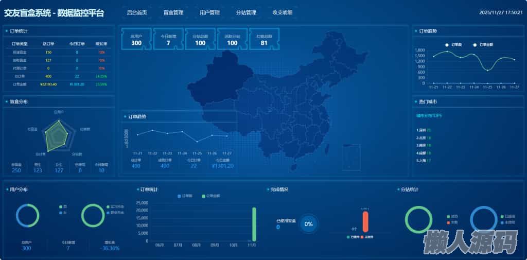 数据大屏:用户、订单、盲盒数量一目了然,连趋势图都给你画好了。