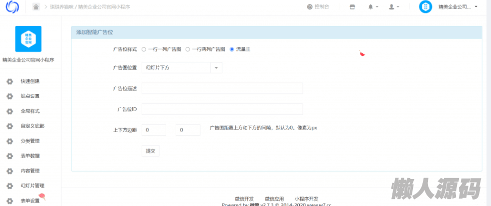 支持创建多个小程序!(理论上只要配置够,可以生成无限个) 可在后台修改全站主题色 支持自定义底部菜单、自定义广告位 支持多种栏目展现方式,包括带缩略图新闻、无缩略图新闻、一行两列图片列表、一行一列图片列表等等 支持多种栏目修饰样式和导航样式 支持自定义表单,能够实时查看客户新提交的表单内容 支持做成小程序导航网站 支持播放视频、所有页面转发、在线客服、一键拨号、地图导航!