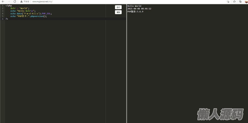 左边输入PHP代码,右边实时显示运行结果,新增了一些语法错误。