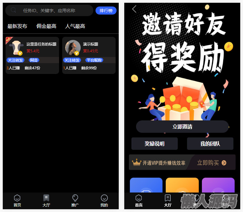 6、支持轮播图、公告、任务搜索、按人气、佣金、时间搜索等。