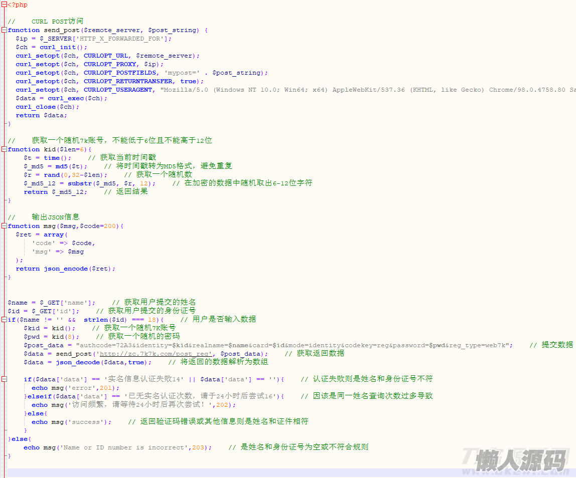 懒人源码 » 利用某K某K游戏验证姓名和身份证的PHP源码