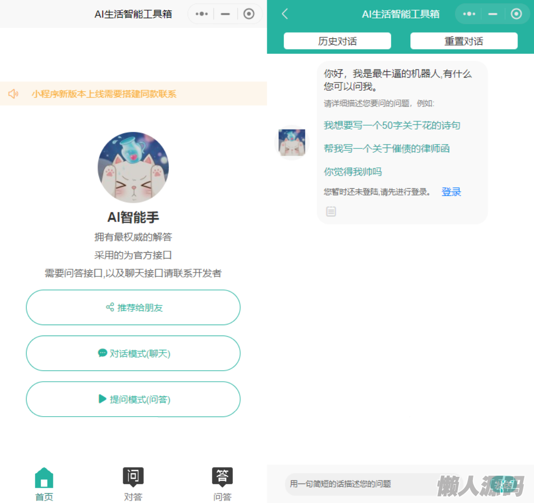懒人源码 » 2023全新ChatGPT3.5小程序开源源码 全新UI 全网首发