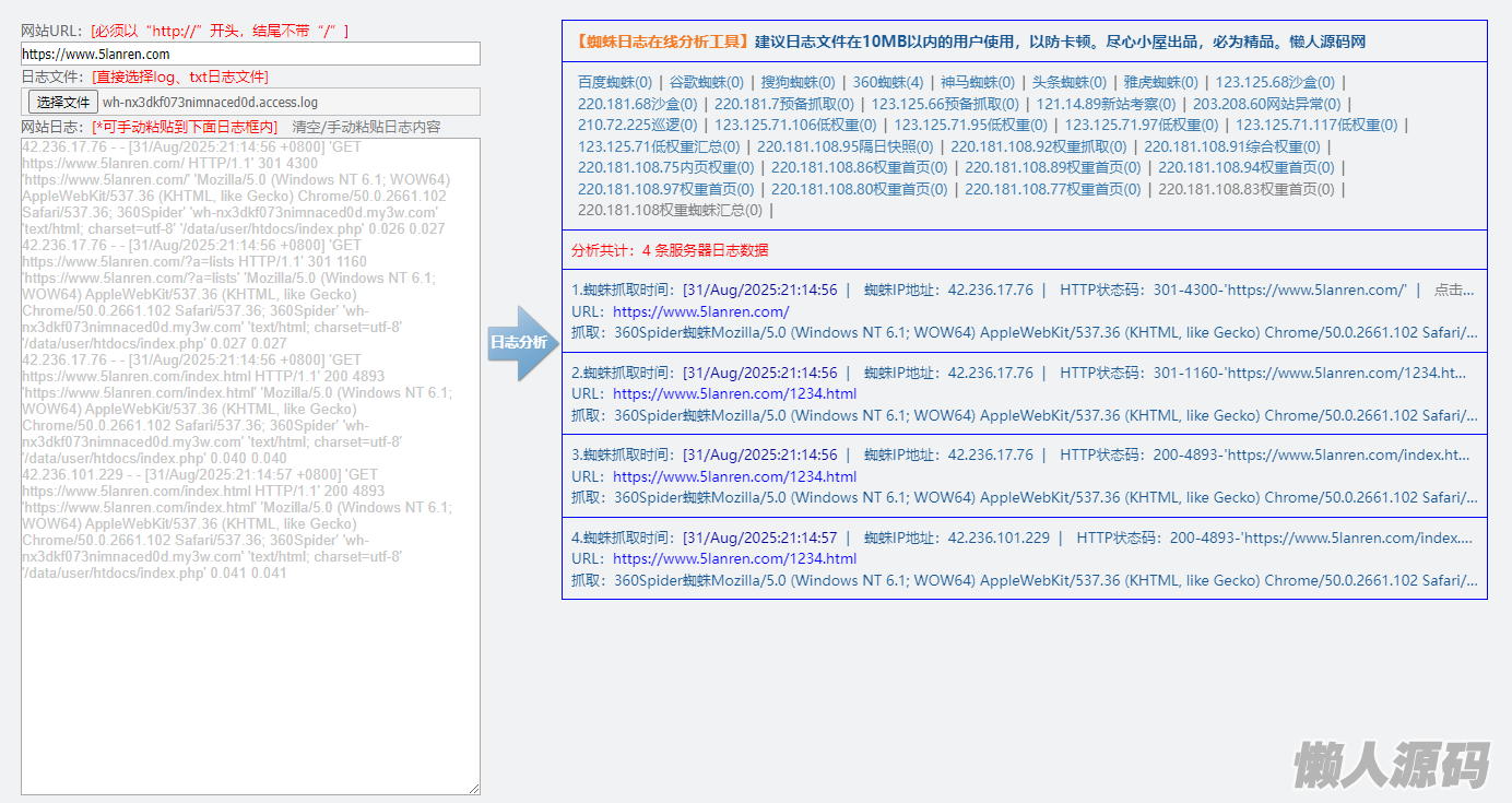 懒人源码 » 网站日志蜘蛛在线分析工具源码 日志可视化管理工具源码 快速分析搜索引擎网络爬虫抓取记录